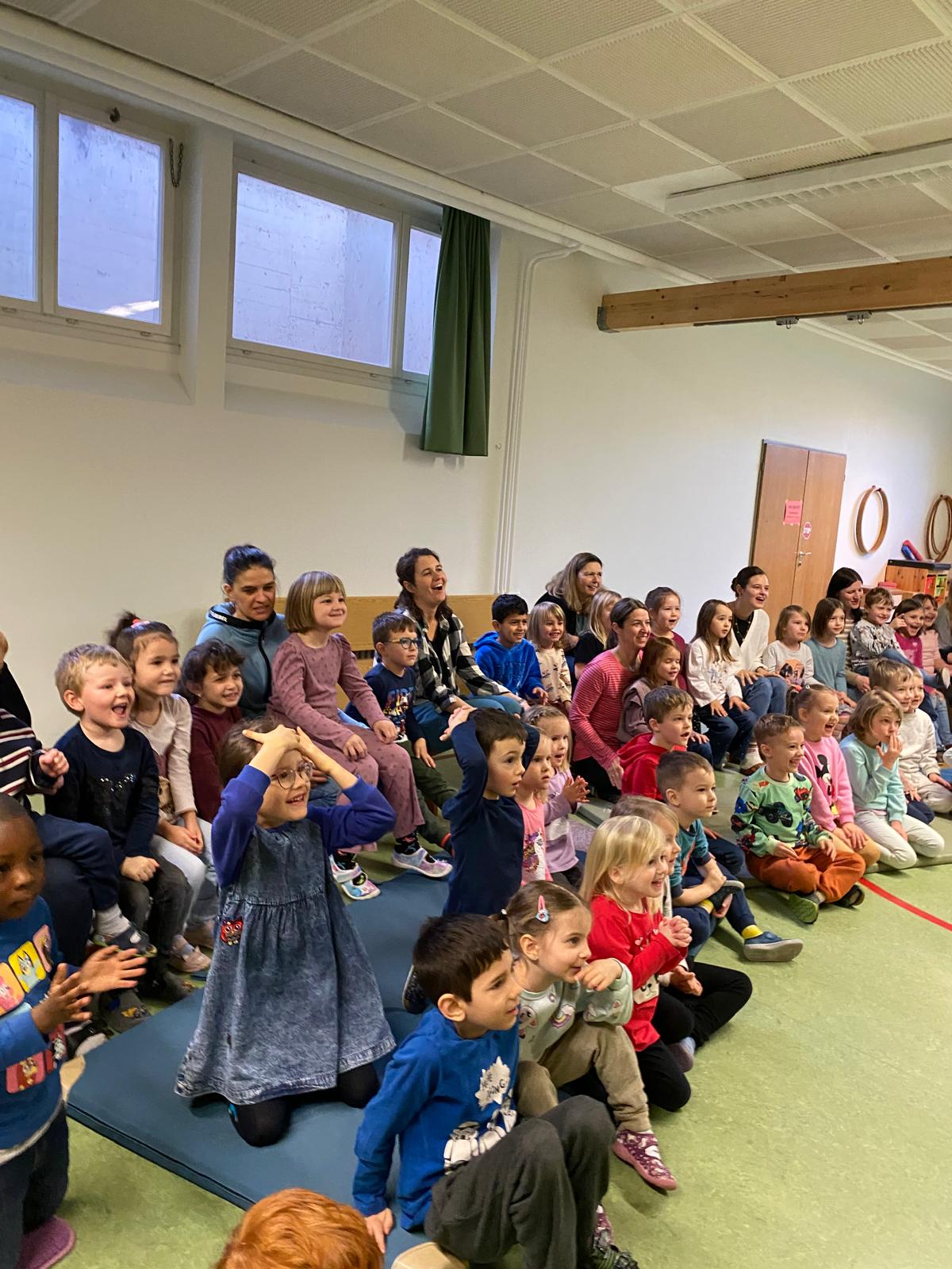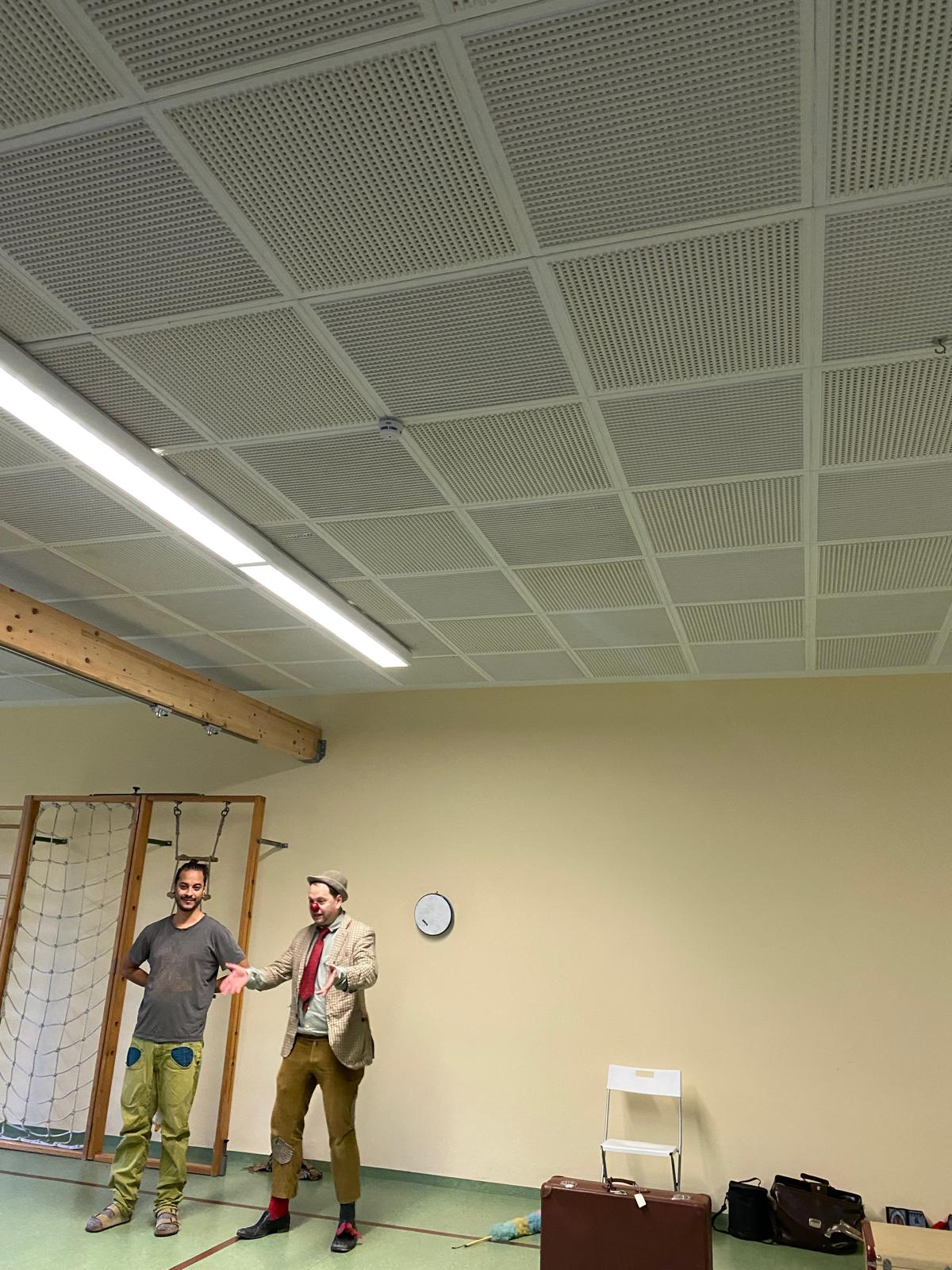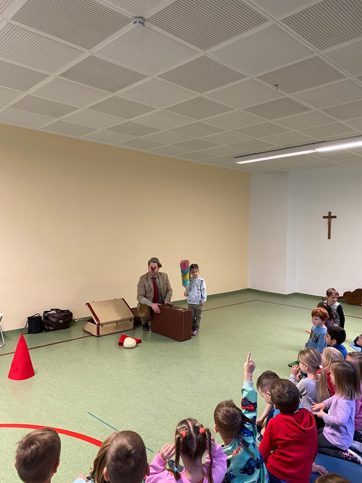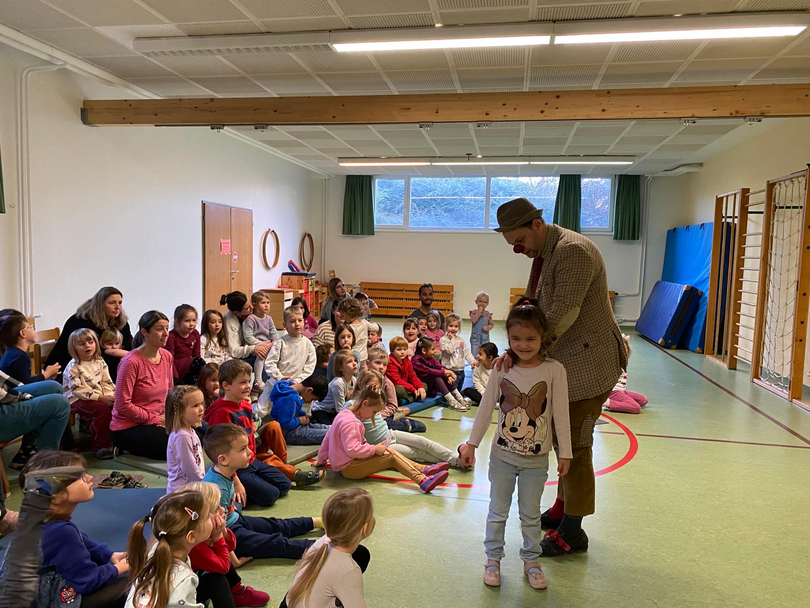Der Clown bereitete mit seinen Zauberkünsten den Kindern viel Freude und es herrschte helle Aufregung und laute Begeisterung im Turnsaal.